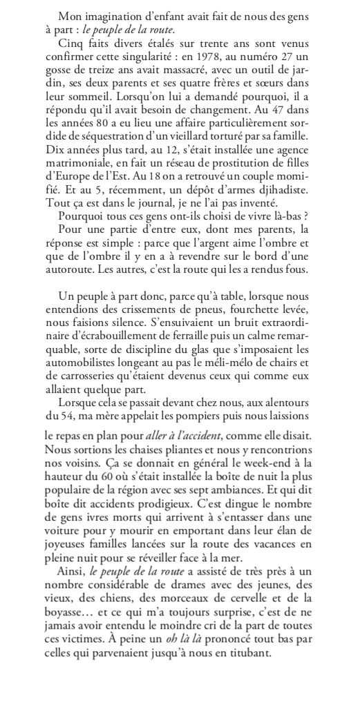 Un grand-père qui se pend en plein jour dans un parc de Genève. Une enfance dans une propriété au bord de l’autoroute dans les Yvelines, devant laquelle sa grand mère s’installe sur un tabouret pour assister aux accidents mortels. Un père qui livre des cargaisons douteuses en Asie. Et puis il y a sa mère…